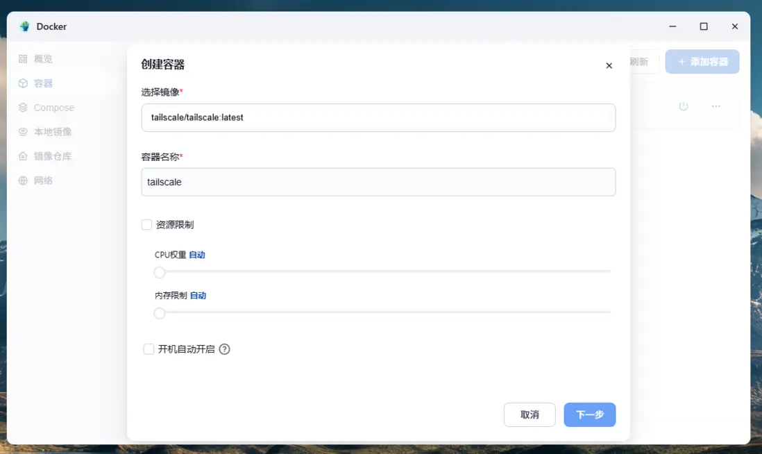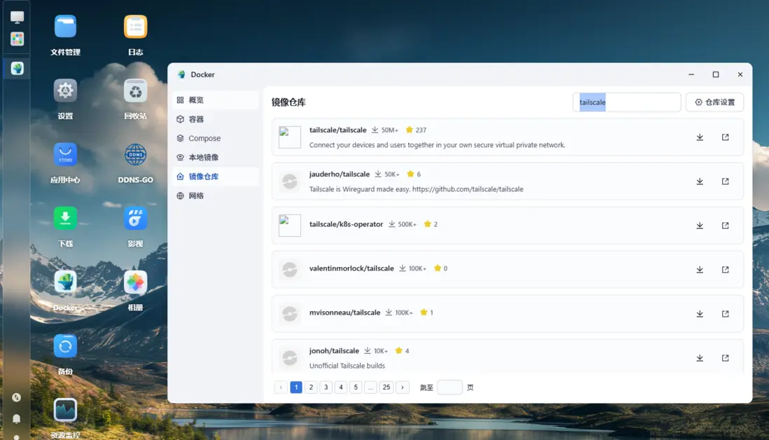 1. 在飞牛系统的Docker商店搜索 tailscale 并下载镜像;