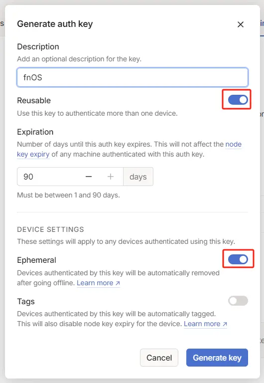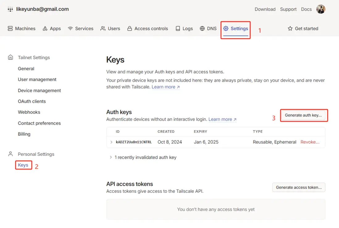 获取授权码页面:https://login.tailscale.com/admin/settings/keys